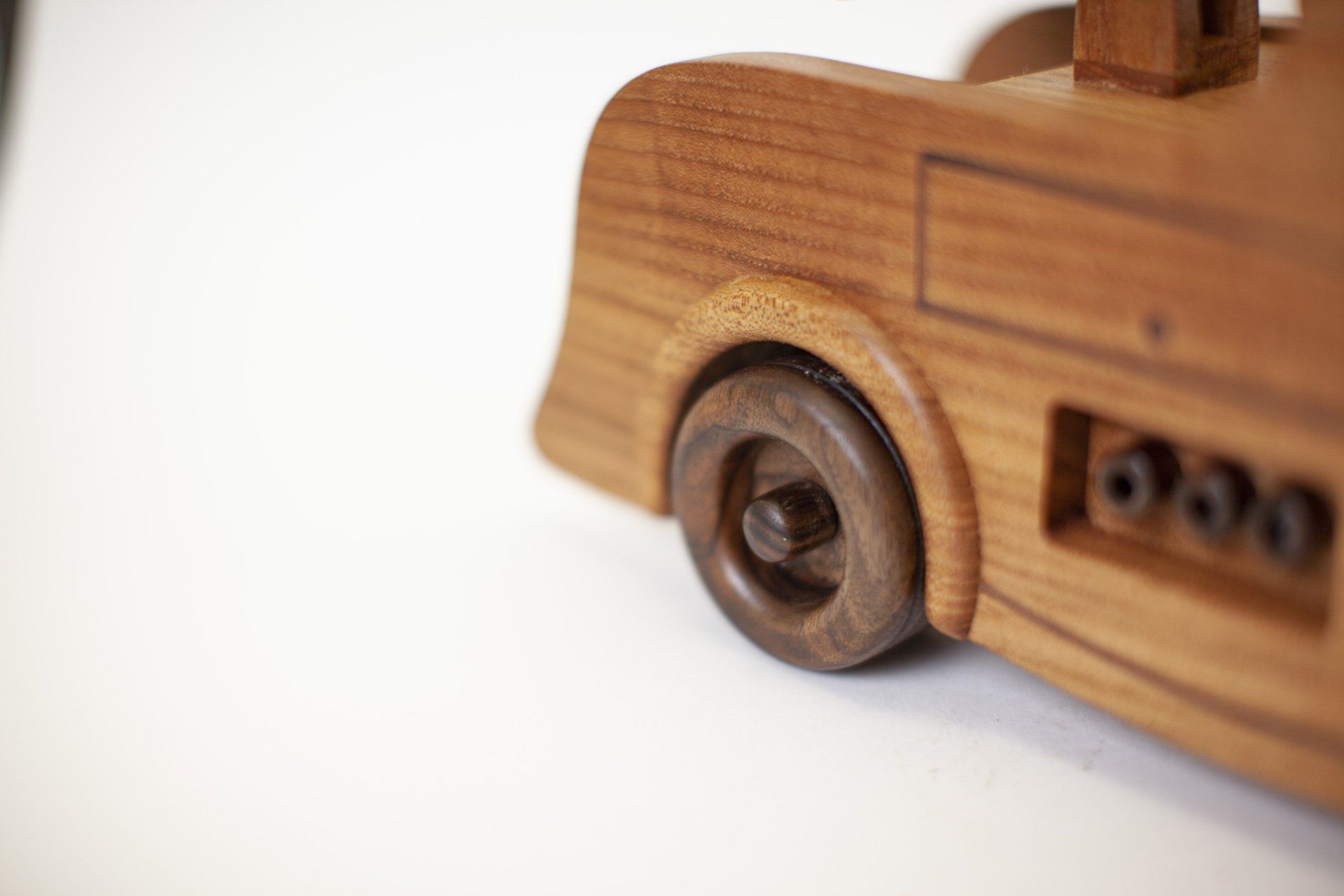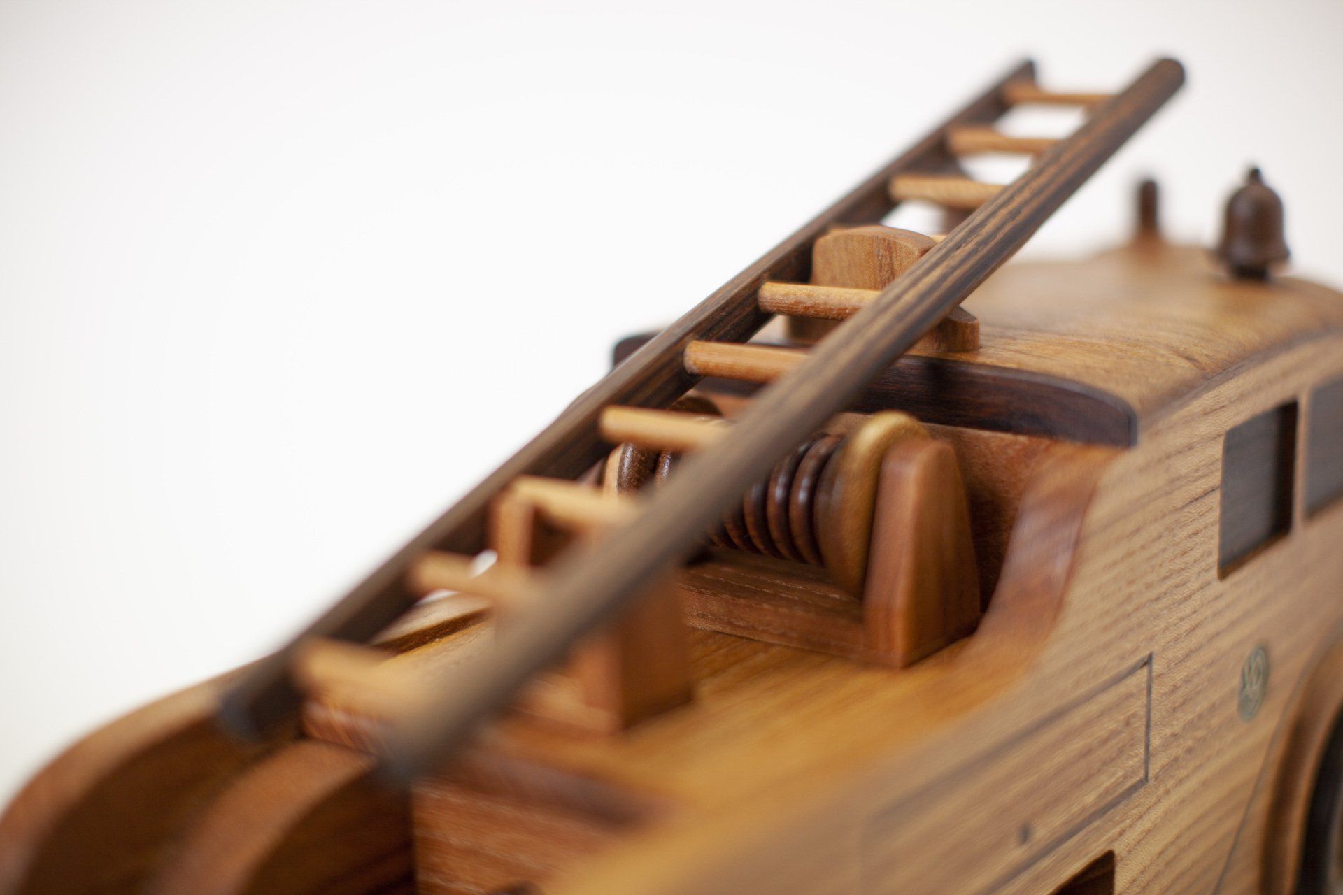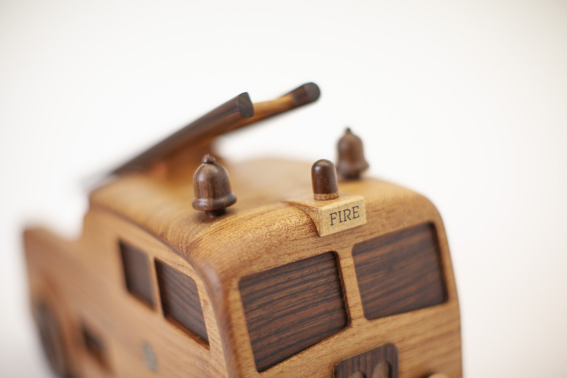 This heirloom toy was based on a few types of 1950s and early 1960s British fire engines. We simplified the design to create fluid lines and smooth transitions. The body is made of Irish elm and with the wheels, windows and ladder in Irish walnut. The headlights and sign were made from Irish holly. There is a drawer at the rear to carry the fire hose and other tools. It closes with a hidden magnet. The fire truck is available to purchase. These are made to order.