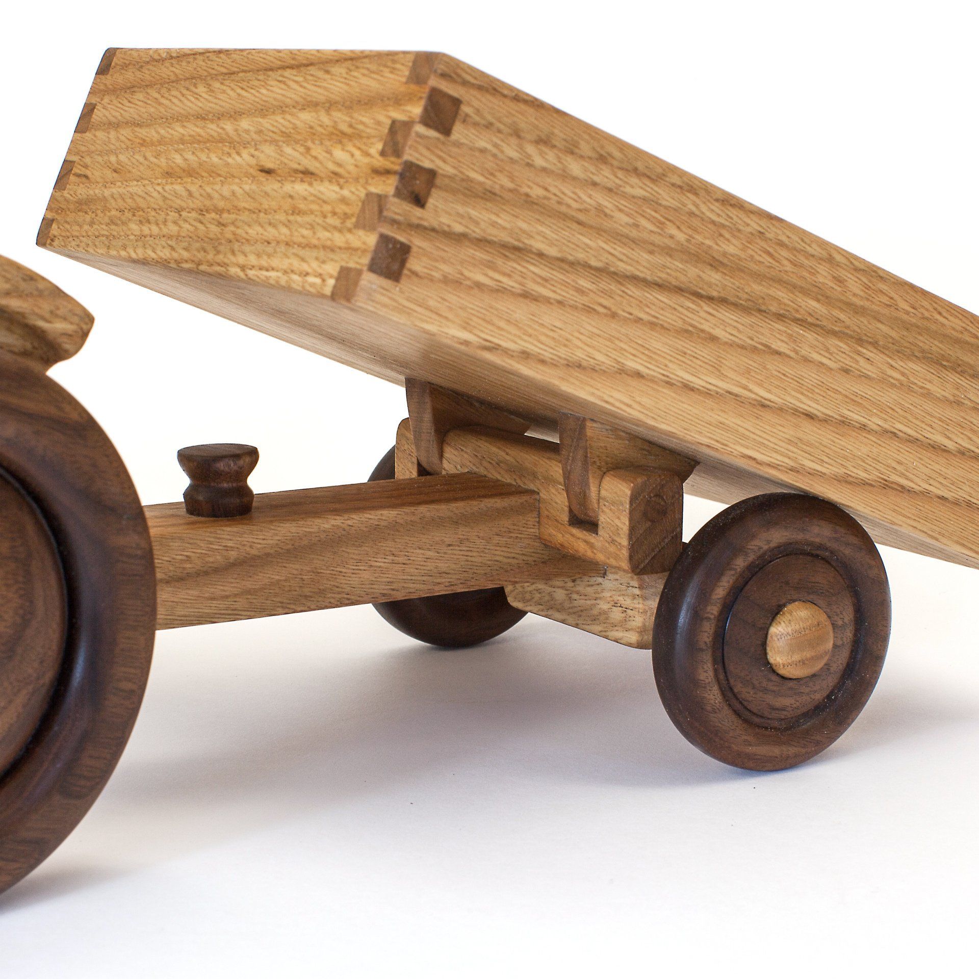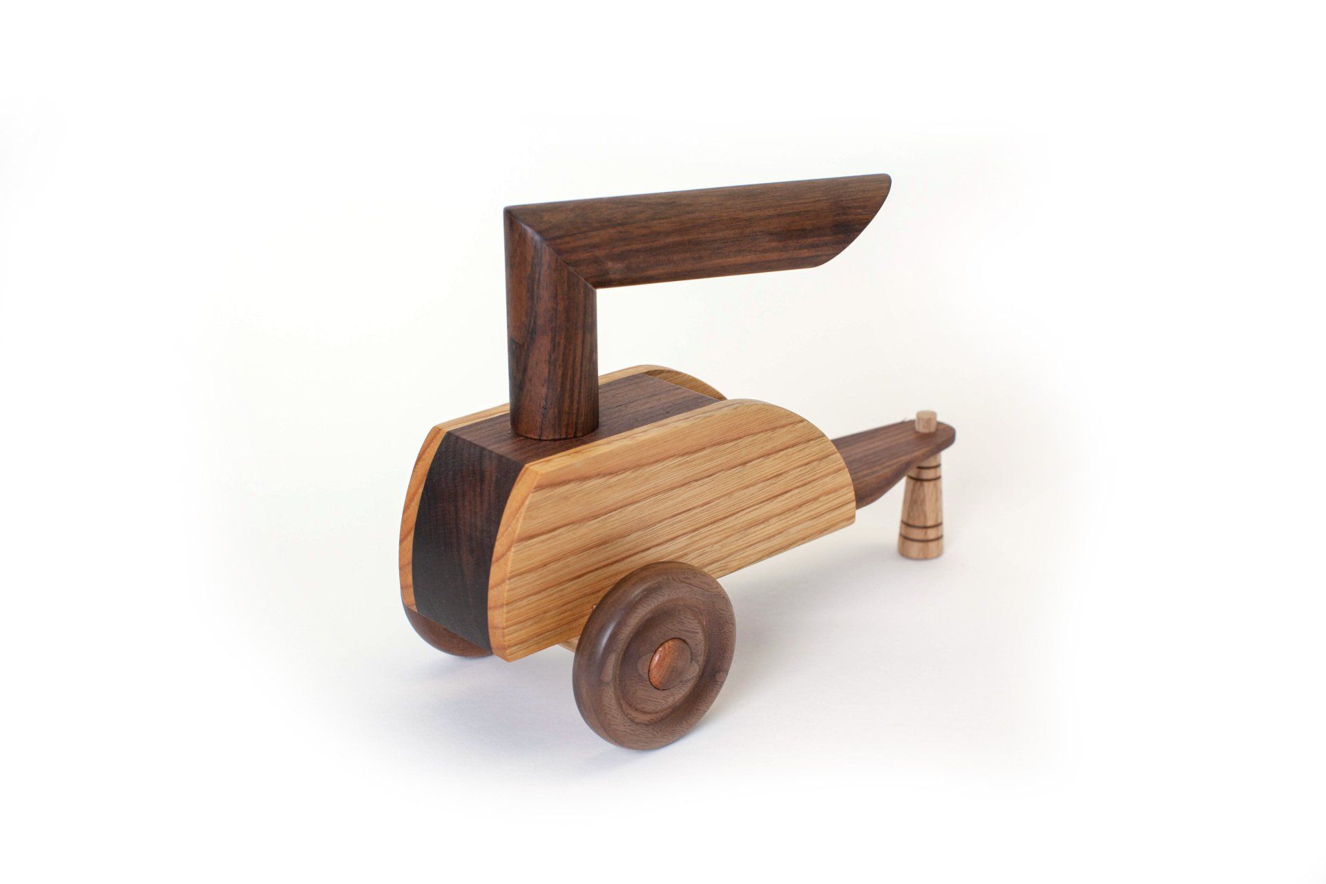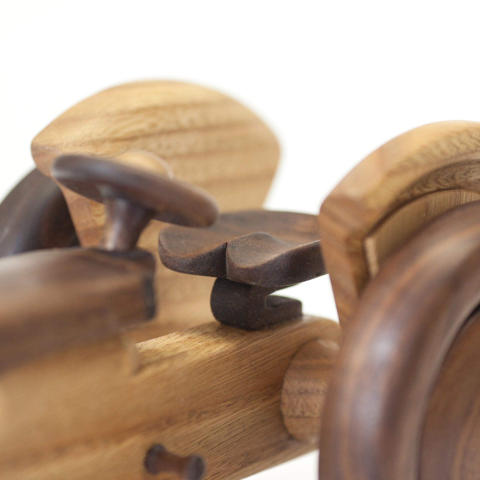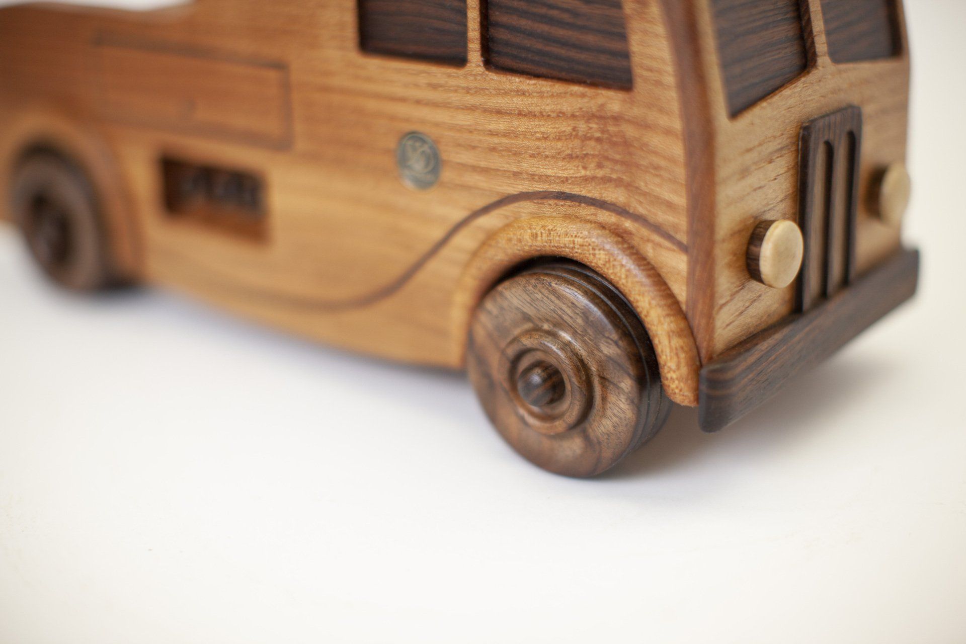 This heirloom toy was based on a few types of 1950s and early 1960s British fire engines. We simplified the design to create fluid lines and smooth transitions. The body is made of Irish elm and with the wheels, windows and ladder in Irish walnut. The headlights and sign were made from Irish holly. There is a drawer at the rear to carry the fire hose and other tools. It closes with a hidden magnet. The fire truck is available to purchase. These are made to order.